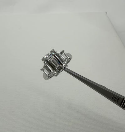 Diamond ring with emerald-cut center with step-cut side stones in white gold