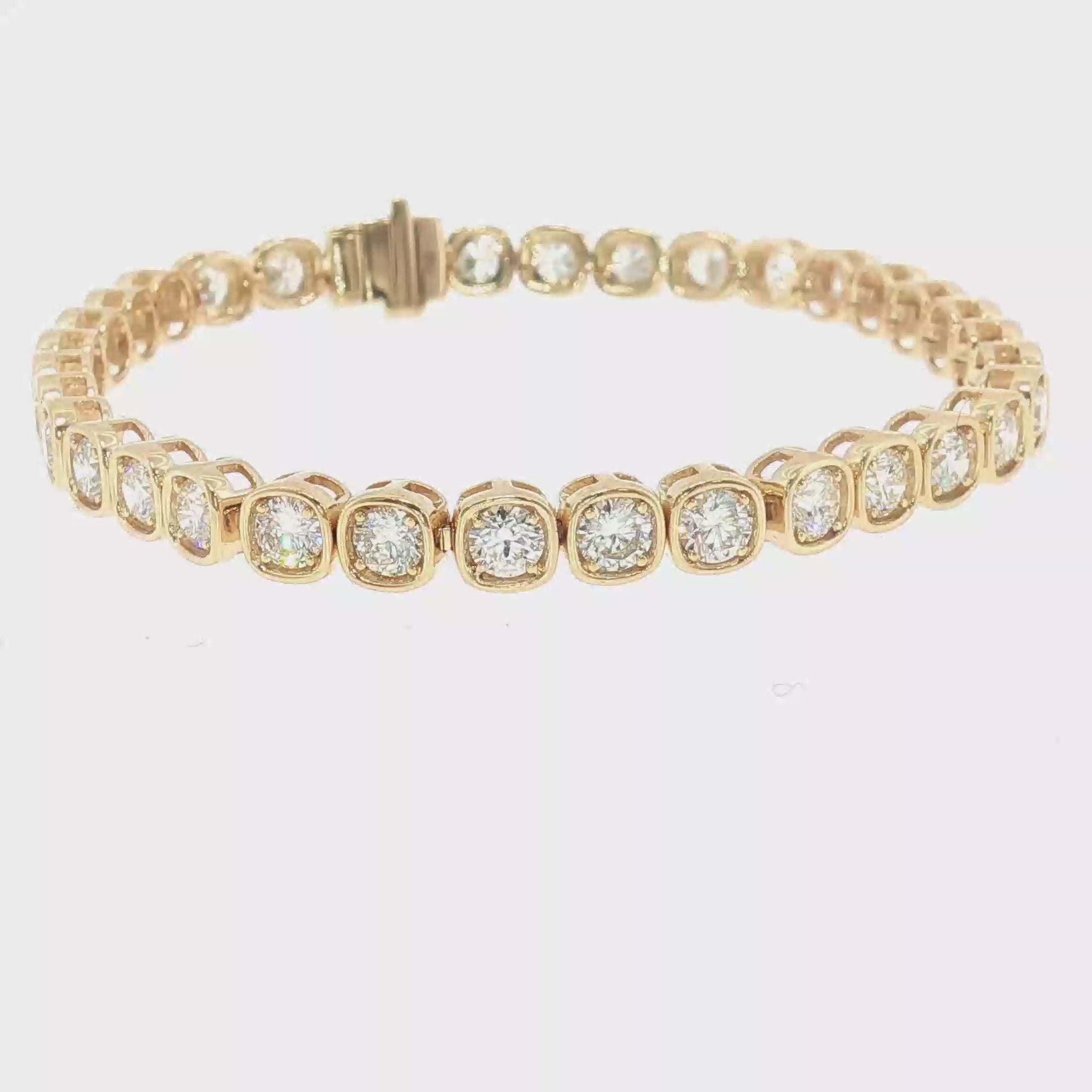 A timeless icon of luxury, this 18K yellow gold tennis bracelet showcases 5.75 carats of brilliant round diamonds in a modern bezel-inspired setting. Perfect for milestone celebrations, anniversaries, or as a luxurious everyday statement.